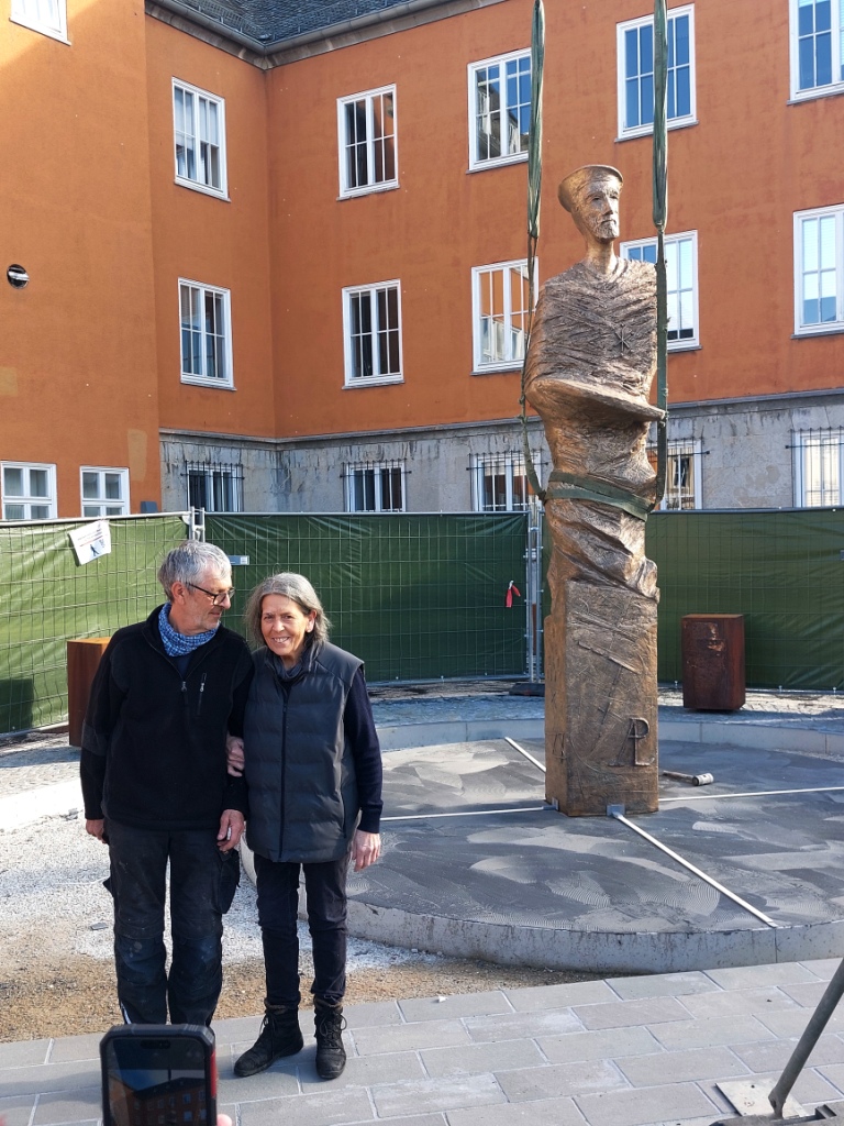 Maria Fernandez mit einem Mitarbeiter vor der Pasqualini-Skulptur