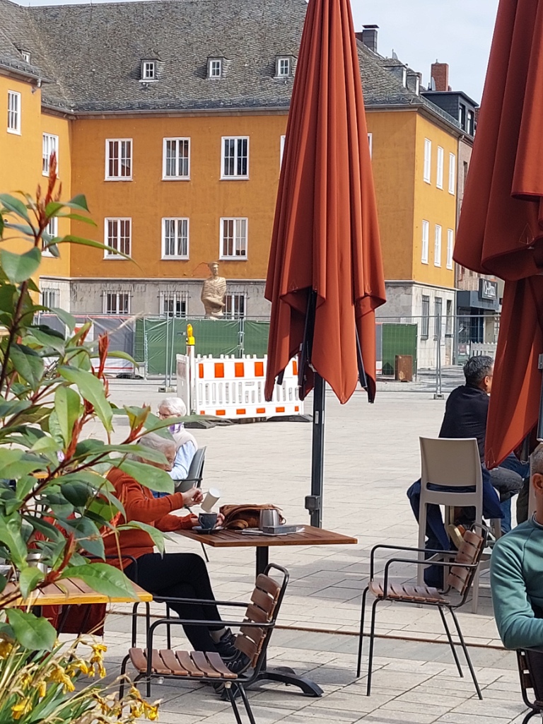 Blick von der Westseite des Marktes auf die noch zum Teil verdeckten Skulptur